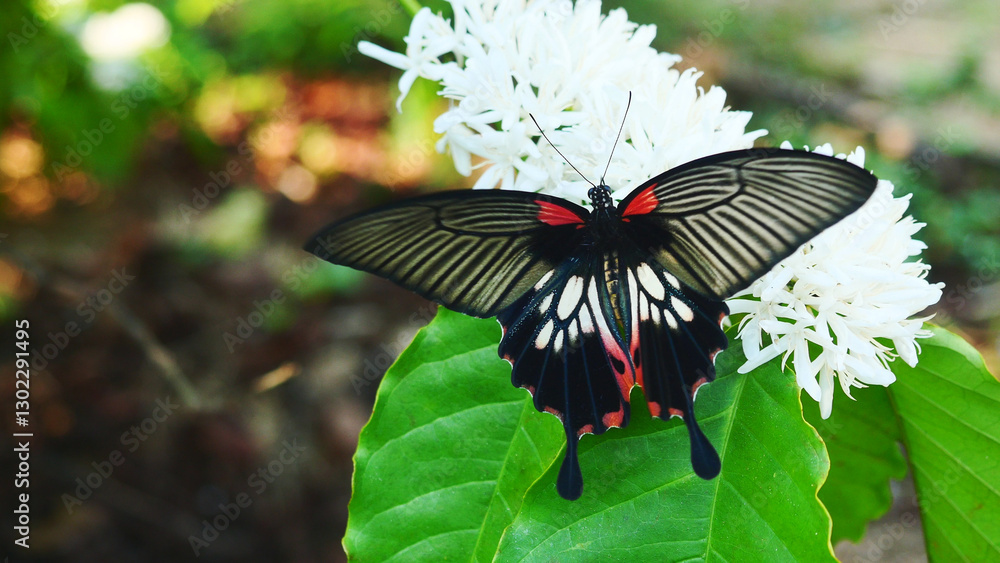 Great Mormon butterfly ( Papilio memnon ) on Robusta coffee blossom on tree plant with green leaf, Petals and white stamens of blooming flowers , Gray and red patterns on black wings of insect