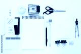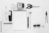 Set of black and white office supplies flat lay. Top view on various stationery on desk: notepads, pencils, scissors, stapler, clip, pins, pen, pencil and bundle of money. Business accessories mocup