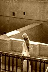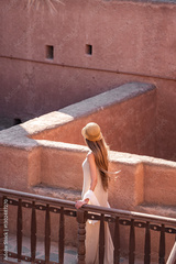 Tourist woman walking in jabrin castle, exploring ancient oman architecture