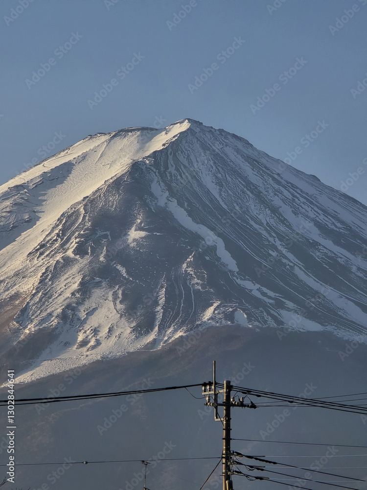 stunning view of snow capped mountain with clear skies and power lines in foreground, showcasing beauty of nature and human infrastructure