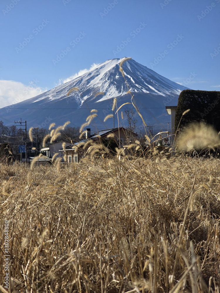 scenic view of Mount Fuji surrounded by golden grass under clear blue sky, capturing beauty of nature and tranquility