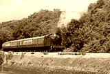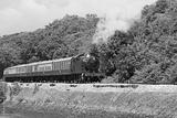 Steam train running along the banks of the River Dart, Devon, UK.