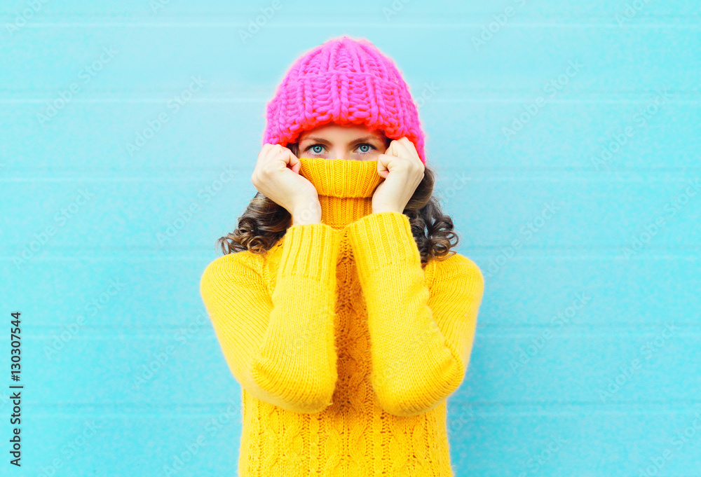 Fashion young woman hide face wearing a knitted pink hat yellow