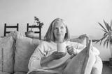 Portrait happy healthy middle aged woman sitting on comfortable couch at home