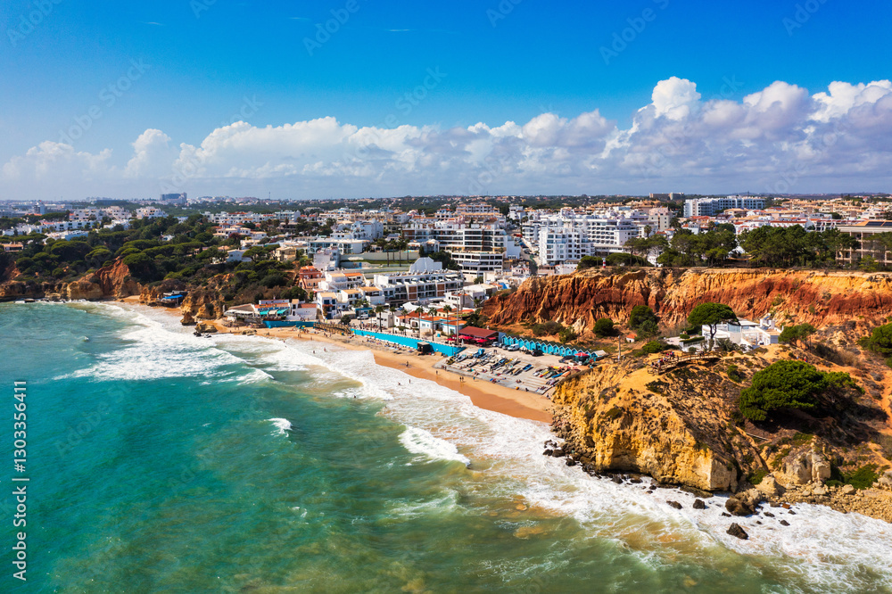 Amazing view from the sky of town Olhos de Agua in Albufeira, Algarve, Portugal. Aerial coastal view of town Olhos de Agua, Albufeira area, Algarve, Portugal.