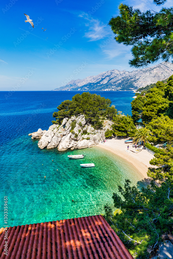 Amazing aerial view of the beautiful Podrace beach in Brela, Makarska Riviera, Croatia. Aerial view of Podrace beach and waterfront on Makarska riviera, Brela, Dalmatia region of Croatia.