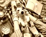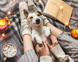 Young woman and her adorable dog sitting on knitted cozy blanket