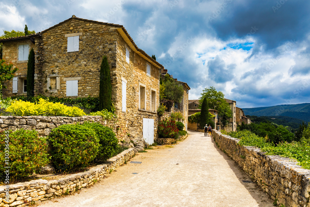 Charming street in quaint Menerbes village with colorful buildings and vibrant flowers. Village of Menerbes (Most Beautiful Village in France) in the Luberon mountains, France, Luberon, Vaucluse.