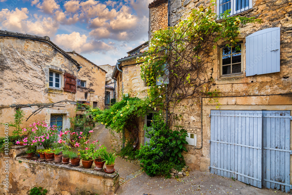 Charming street in quaint Menerbes village with colorful buildings and vibrant flowers. Village of Menerbes (Most Beautiful Village in France) in the Luberon mountains, France, Luberon, Vaucluse.