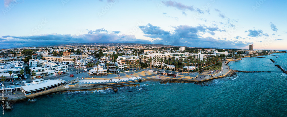 View of the town of Paphos in Cyprus. Paphos is known as the center of ancient history and culture of the island. View of embankment at Paphos Harbour, Cyprus.