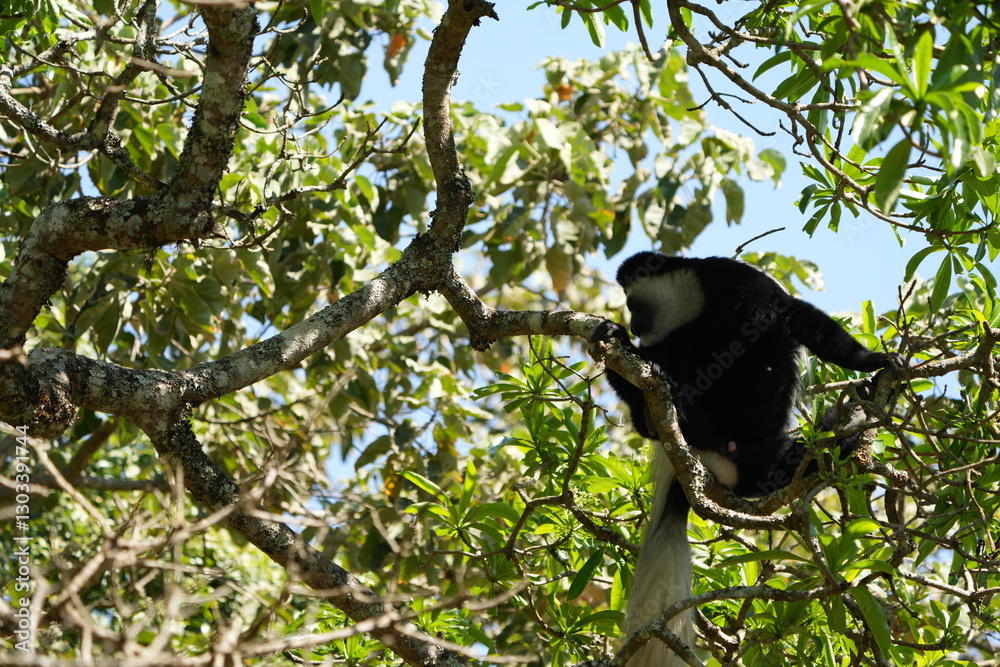 Black-and-White Colobus Monkey in Tree Canopy – Arusha, Tanzania