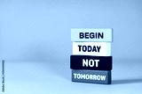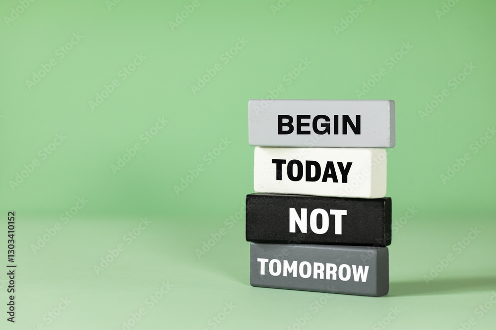 Begin Today Not Tomorrow. Words on wooden blocks. Inspiring slogan. Business activity. Motivational quotes for business, startups and success. Copy space