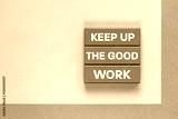 Keep up the good work, text is written on wooden blocks, Business concept, Motivating slogan, work commitment, good job. copy space, Business background