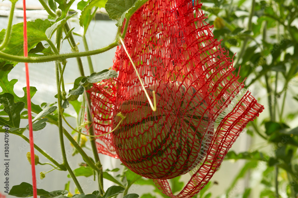 Vertical growing of watermelons in the greenhouse. Gartering a large fruit in a synthetic net - avoska. Macro.
