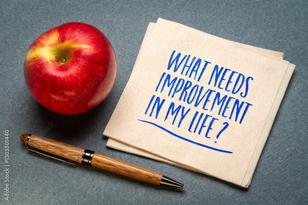 What needs improvement in my life? A motivational question on napkin. Personal development concept.