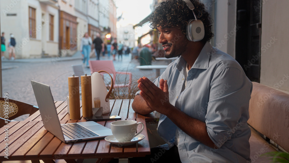 Arabian Indian man ethnic guy customer tourist businessman male freelancer video call laptop conference internet chatting talking in headphones friendly online meeting in city cafe outdoors smiling