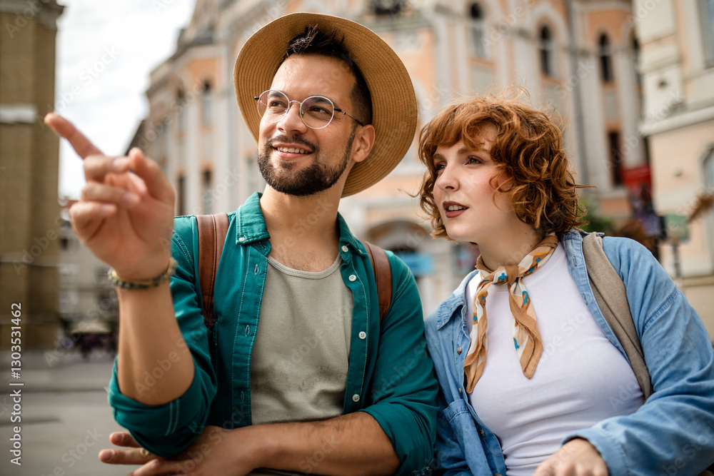 Couple exploring the city. Boyfriend showing his girlfriend monuments and buildings in the city center. Travelling concept.