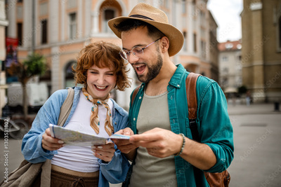 Young couple using a map to explore the new city on their vacation.
