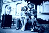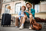 Happy couple sitting in the city center. They are using their phone so they don't get lost. Having their luggages and backpacks with them.