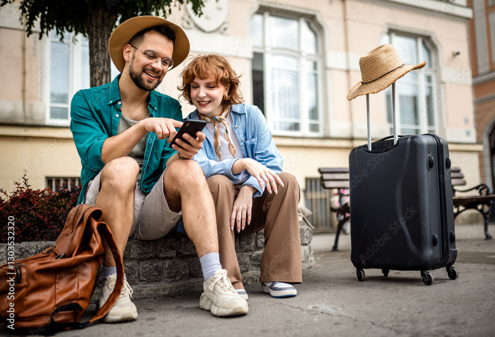 Happy couple sitting in the city center. They are using their phone so they don't get lost. Having their luggages and backpacks with them.