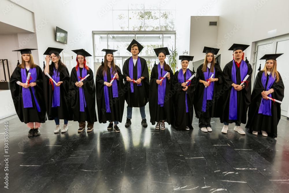 Group of graduates with togas and diplomas standing happy in the hall and looking at the camera.