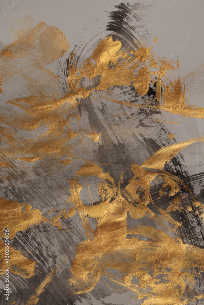 Black, gold grunge Ink watercolor brush stroke painting smear blot. Abstract grunge stain on wet gray craft paper background.