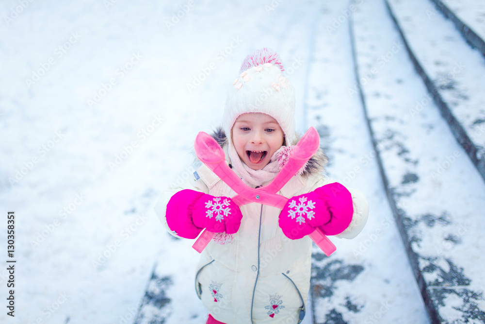 Adorable little girl having fun on winter day