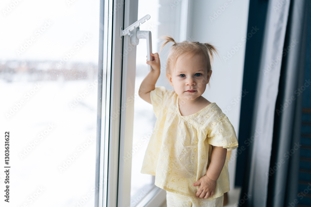 Portrait of adorable toddler girl holding touching toward window handle, focused looking at camera. Concept of potential home safety risks for curious preschoolers exploring indoor spaces.