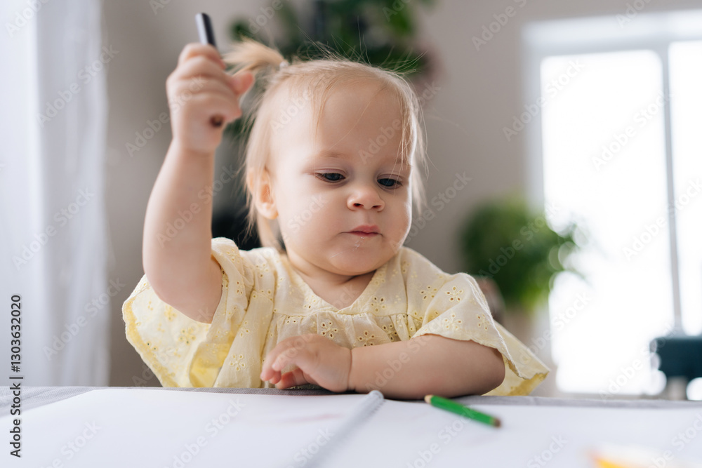 Close-up portrait of focused toddler girl drawing with colored pencils on paper notebook, sitting at table, expressing creativity and enhancing fine motor skills while enjoying artistic play at home.