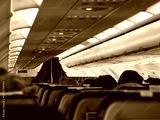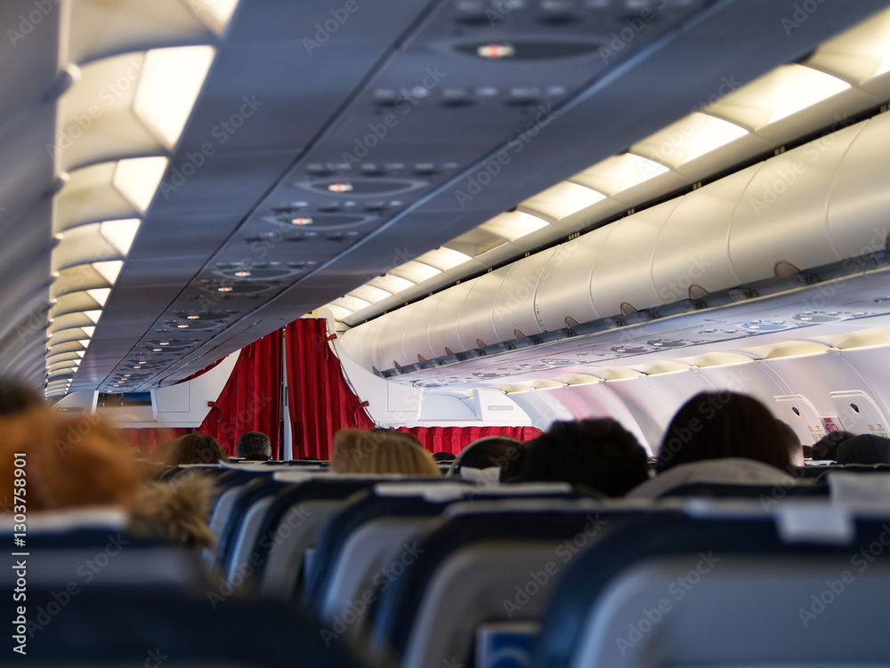 Airplane cabin with passengers, overhead compartments, and a red curtain separating sections