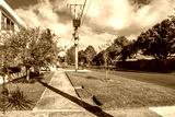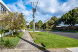 A quiet residential street in a Melbourne suburb with a concrete footpath, well-maintained front yards, power lines, and neat nature strips. A typical Australian suburban streetscape.