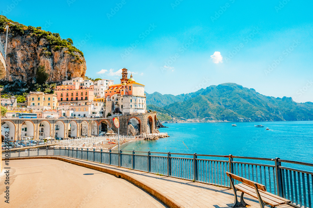 Atrani famous coastline in southern Italy, vertiginous cliffs adorned with colorful villages, turquoise waters. Small town Atrani on Amalfi Coast in province of Salerno, Campania region, Italy