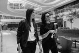 Two female coworkers walking through a modern office space