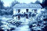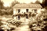 Oil painting on canvas of a beautiful house and flowers, abstract drawing, watercolor art