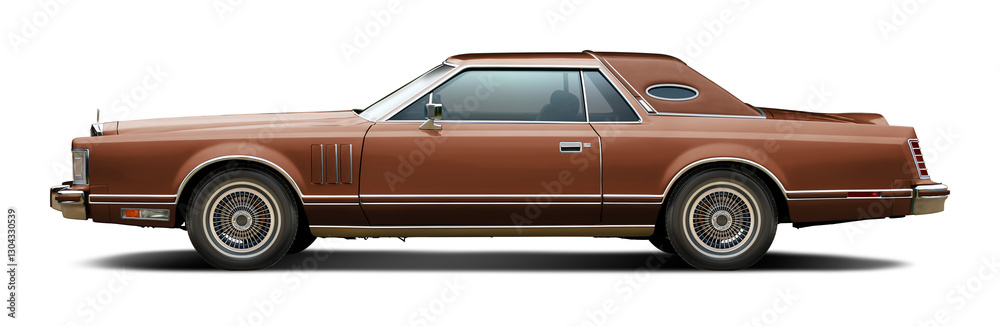Classic American luxury car in brown. With a coupe body and a soft top in brown. In png format on a transparent background.