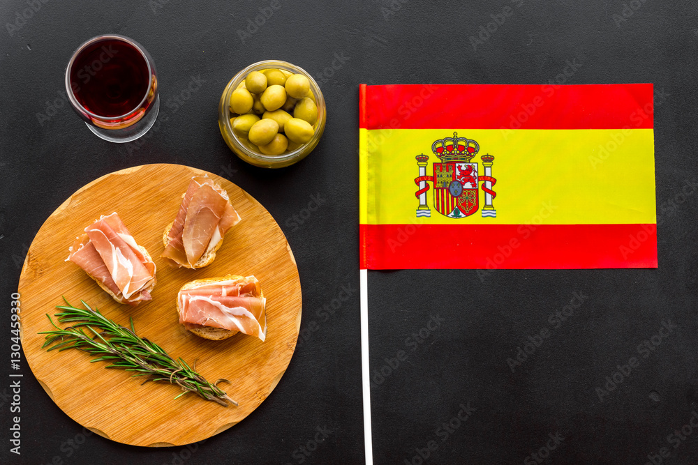 Sliced jamon on cutting board. Parma ham with wine. Traditional Spanish meal