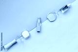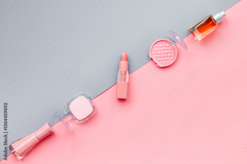 Makeup accessories - brushes and pink pastel cosmetic products, flat lay, top view