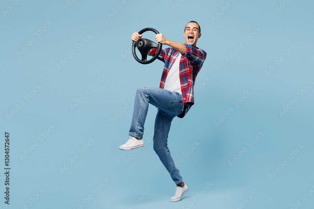 Full body side view young happy middle eastern man wear red shirt casual clothes hold steering wheel driving car isolated on plain pastel light blue cyan background studio portrait. Lifestyle concept.