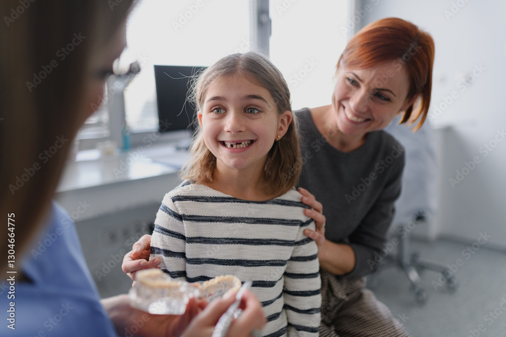 Girl showing her lost tooth to the dentist during a routine checkup at the dental clinic.