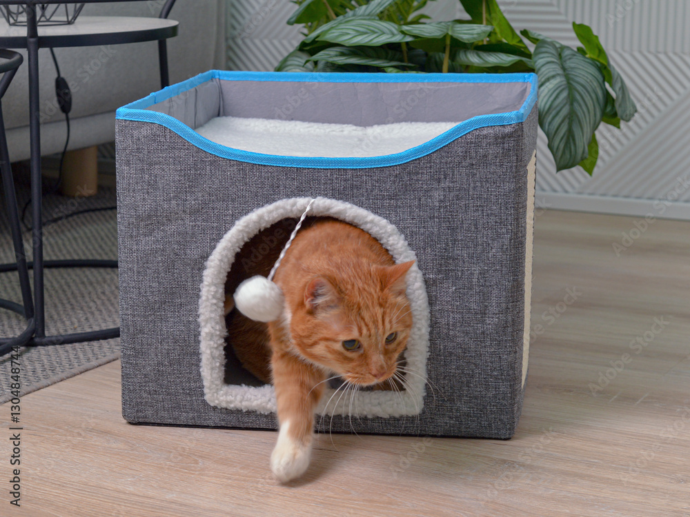 Рыжий кот выходит из домика для животных. Фото в интерьере