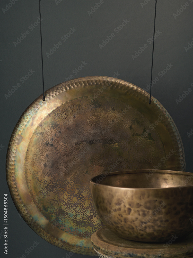 На темно-сером фоне висит гонг. Рядом с ним стои большая тибетская чаша