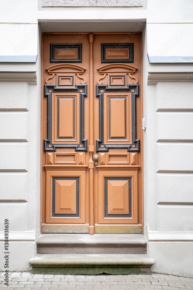 Vintage Ornate Wooden Door with Detailed Design on City Building