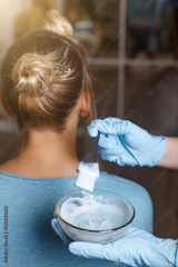 Professional hairdresser dyeing hair of her client in salon. Selective focus.
