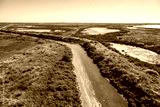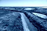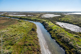 An aerial view of the Cheetham Wetlands, Melbourne. A winding water channel cutting through wetlands. A mix of vegetated areas with green shrubs and grasses, salt flats, shallow water, and mud banks.