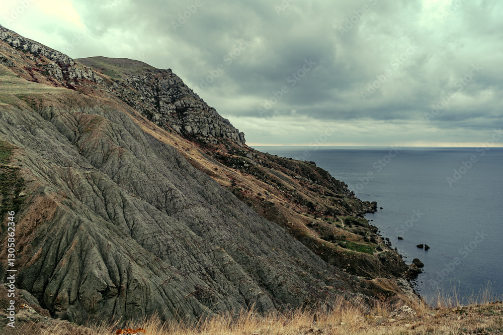 Coastal cliffs against a dramatic sky near a calm sea, capturing the raw beauty of nature in a remote landscape