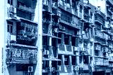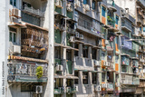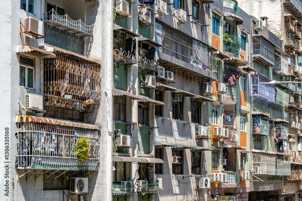 Exterior of an aging and weathering residential apartment building in Macau, China with a dense arrangement of balconies with various security grilles, air conditioning units, and hanging laundry.