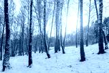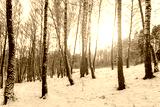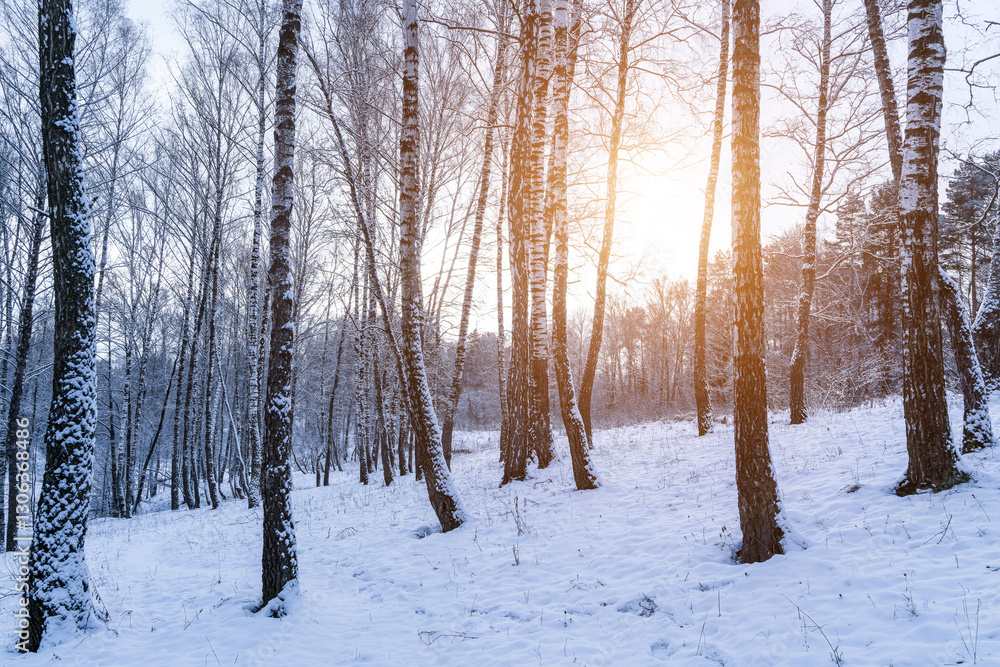 Birch grove after a snowfall on a winter. Sunlight breaking through the branches.