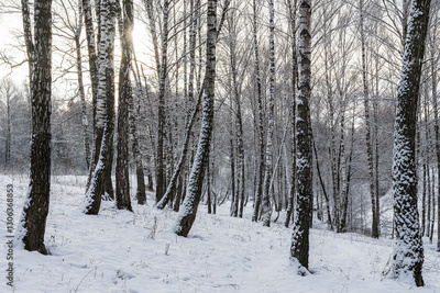 Sunbeams shining through snow-covered birch branches in a birch forest after a snowfall on a winter.