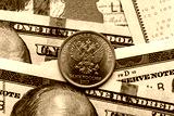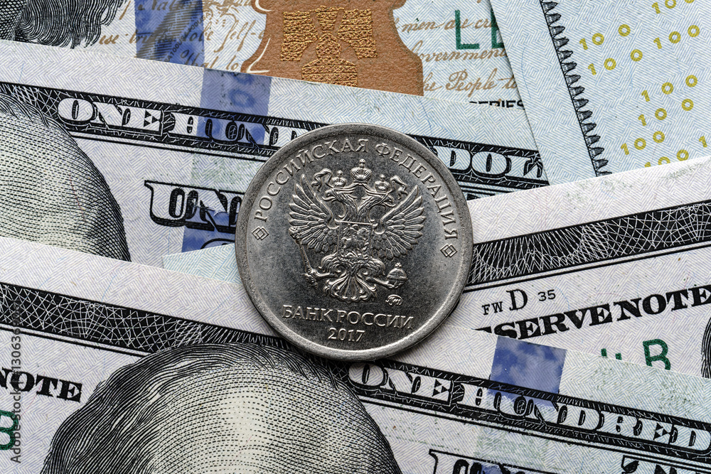Close-up of Russian rubles coin on US 100 dollar bills in focus.