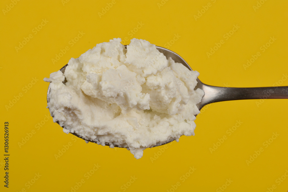 A close-up shot of a spoonful of creamy white cottage cheese against a yellow background, showcasing its lumpy texture